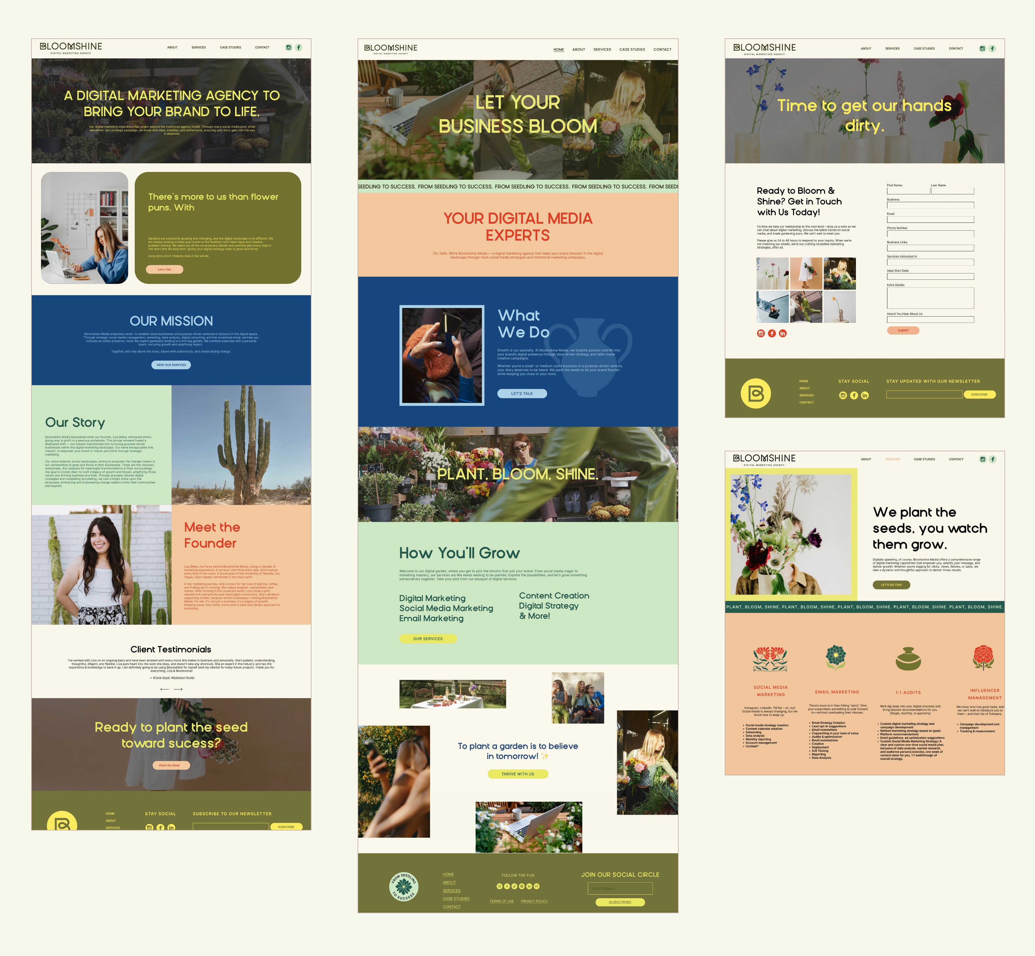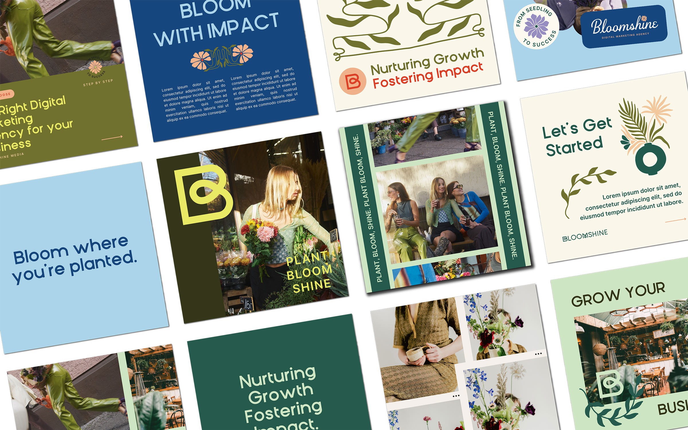 Bloomshine Media partnered with Westward Studio for brand strategy, and I translated that foundation into practical design systems and digital touchpoints. Built comprehensive brand guidelines with application templates the team could implement as they scale. Designed and developed their website in Squarespace, focusing on user experience and showcasing their services. Created social media graphics that reinforce brand recognition and support their growth in a competitive media landscape.